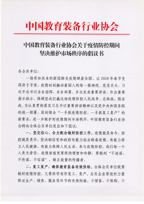 一場突如其來的新冠肺炎疫情肆虐全國,讓2020年春節(jié)變得異于尋常,疫情時刻觸動著國人的每一根神經(jīng)。危急關(guān)頭,習(xí)近平總書記親自指揮、親自部署,多次發(fā)表重要講話、作出重要指示批示,強(qiáng)調(diào)堅決打贏這場疫情防控人民戰(zhàn)爭、總體戰(zhàn)、阻擊戰(zhàn)。為認(rèn)真貫徹落實習(xí)總書記重要講話精神以及黨中央和國務(wù)院的統(tǒng)一部署,深刻領(lǐng)會“一手抓疫情防控、一手抓復(fù)工復(fù)產(chǎn)”的新要求,進(jìn)一步維護(hù)好疫情期間市場秩序,中國教育裝備行業(yè)協(xié)會特向全體會員單位發(fā)出如下倡議: