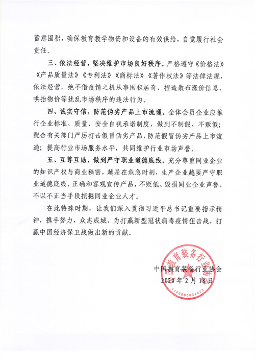 一場突如其來的新冠肺炎疫情肆虐全國,讓2020年春節(jié)變得異于尋常,疫情時刻觸動著國人的每一根神經(jīng)。危急關(guān)頭,習(xí)近平總書記親自指揮、親自部署,多次發(fā)表重要講話、作出重要指示批示,強(qiáng)調(diào)堅決打贏這場疫情防控人民戰(zhàn)爭、總體戰(zhàn)、阻擊戰(zhàn)。為認(rèn)真貫徹落實習(xí)總書記重要講話精神以及黨中央和國務(wù)院的統(tǒng)一部署,深刻領(lǐng)會“一手抓疫情防控、一手抓復(fù)工復(fù)產(chǎn)”的新要求,進(jìn)一步維護(hù)好疫情期間市場秩序,中國教育裝備行業(yè)協(xié)會特向全體會員單位發(fā)出如下倡議: